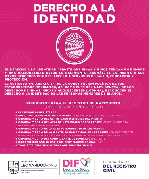 El Sistema Municipal DIF en coordinación con la dirección de Registro Civil, te ayudamos para que puedas registrar a tu hijo y así pueda obtener su derecho de identidad. Acude a las oficinas del DIF Municipal o oficinas del registro civil para asesorarte en el registro del infante.