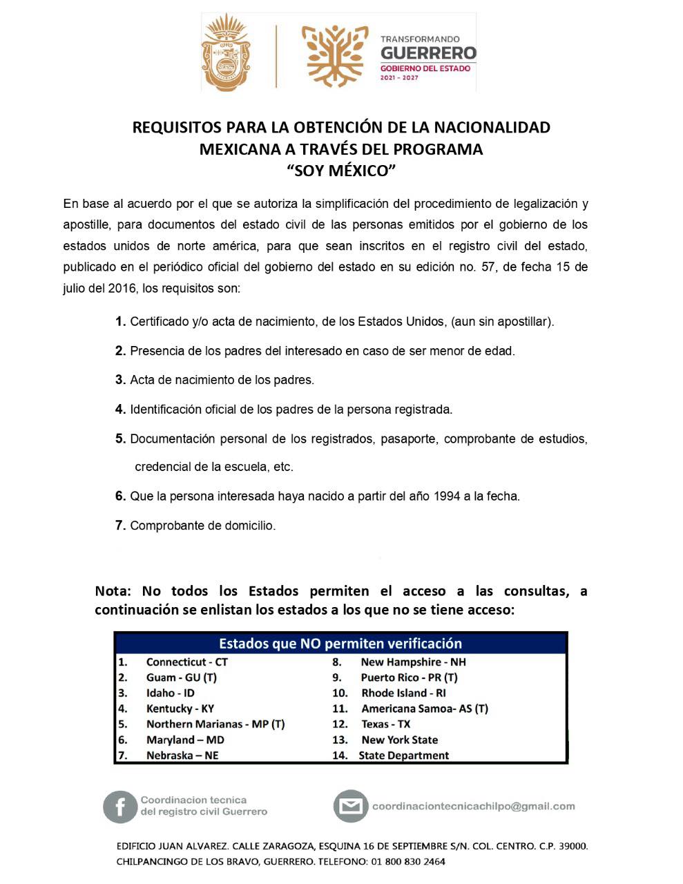 Se informa a todas las personas que nacieron en Estados Unidos de América, posterior al año de 1994, y aún no hayan realizado su inscripción de nacimiento en el país, se les invita a participar en el programa “Soy México”, el cual consiste en realizarles el trámite de inscripción de nacimiento, para poder adquirir su doble Nacionalidad. La fecha de recepción de documentos será, a partir del día martes 02 de marzo, al día miércoles 09 de marzo del presente año en las oficinas del Registro Civil en un horario de 10:00am a 2:00pm